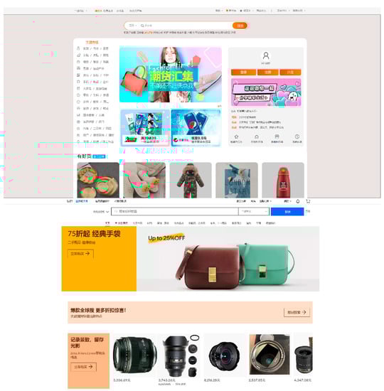 Two shopping websites replicated with the Adobe XD software (the top is China’s largest e-commerce platform—Taobao, and the bottom is the U.S. e-commerce platform eBay).