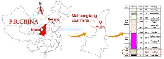 Figure 1 shows the sampling site of the gangue and the stratum where the gangue is located. The gangue was taken from the Mahuangliang Coal Mine in Yulin City, Shaanxi Province, China. The mine is located in the border area between the Maowusu Desert and the Loess Plateau in northern Shaanxi. The ecological environment is fragile; therefore, more attention needs to be paid to the treatment of surface gangue [23]. The gangue used in this study is mudstone gangue [24], which is generally irregular in shape and has sharp edges and corners. The specific parameters are shown in Table 1.