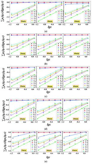Formula (1) was used to calculate the partition function of gangue PSD characteristics such as Table 3. As shown in Figure 3, gangue particle sizes were partitioned when the ball grinding time was 10–60 min and the ball-to-gangue ratio was 3–15. In the multifractal system, whether ∑μi(q,ε), lgμi(q,ε) and lg(ε) are linear is a key index to judge whether the research object has multifractal characteristics in the study scale [33]. Figure 3 elucidates that the variation of the relation curve of ∑μi(q,ε)lgμi(q,ε)~lg(ε) with q can be fitted by a cluster of oblique lines. The linear relationship is significant (R2 > 0.90) and exhibits good scale invariance over the whole scale, making it possible to conduct multifractal analysis of PSD under different ball milling conditions.