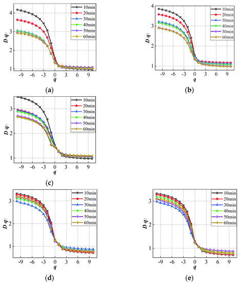 Generalized dimension spectrum curve of gangue under different ball-to-gangue ratios and grinding times. (a) The ball-to-gangue ratio is 3. (b) The ball-to-gangue ratio is 6. (c) The ball-to-gangue ratio is 9. (d) The ball-to-gangue ratio is 12. (e) The ball-to-gangue ratio is 15.