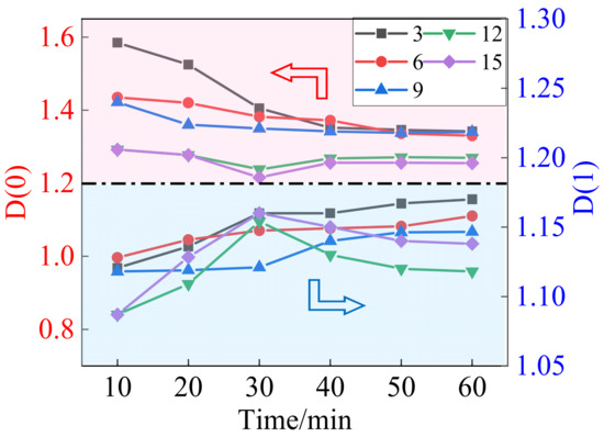 The capacity dimension D(0), the information entropy dimension D(1), and the ratio of the information entropy dimension to the capacity dimension D(1)/D(0) are essential parameters reflecting the multifractal characteristics of granular material PSD [36]. Figure 5 describes the generalized dimension spectrum parameters D(0) and D(1) of gangue under different ball milling conditions, When the ball-to-gangue ratio is 3~9, D(0) ranges from 1.3 to 1.6 and gradually decreases within 60 min, and D(1) ranges from 1.12 to 1.17 and gradually increases within 60 min. This is because the particles are refined in the process of ball milling. While the large particles are reduced, the number of small particles increases, the overall particle distribution range is narrowed, and the degree of variation of particle size distribution is increased.