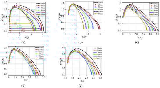 Partition function clusters of the gangue powder. All of the correlation coefficients (R2) are greater than 0.90. (a) The ball-to-gangue ratio is 3. (b) The ball-to-gangue ratio is 6. (c) The ball-to-gangue ratio is 9. (d) The ball-to-gangue ratio is 12. (e) The ball-to-gangue ratio is 15.