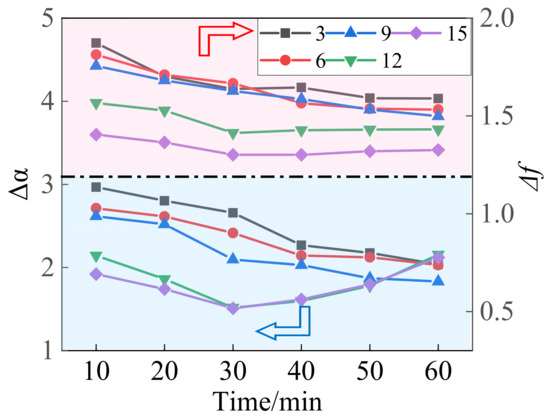Figure 6 depicts multifractal singular spectrum curves of gangue dispersion under different ball-to-gangue ratios and grinding times. The singular spectrum curve shape reflects the shape of the multifractal spectrum characteristics and local variation of the structure characteristics of the PSD when Δf > 0, with a left-hook shape, reflecting symmetrically dispersed particles, and a large size dominates, with a greater variation in large size than in small size [39]. The f(α(q))~α(q) curves under each working condition in the figure are all asymmetrical “left hook” curves, indicating that the spatial variability of gangue particle size during the ball milling process is dominated by the variation of large particles. In addition, the size of Δf reflects the variability of the research object. The distribution of the singular spectrum parameter Δf in the ball milling process of the finishing gangue is shown in Figure 7. When the ball-to-gangue ratio is 3~9, Δf shows a gradually decreasing trend, with a variation range of 1.49~1.87. When the ball-to-gangue ratio is 12~15, Δf decreases firstly and then increases, and reaches a maximum value at 30 min, demonstrating that the variation degree of gangue’s large particle size gradually decreases and then increases. The variability of gangue’s particle size structure is the strongest at about 30 min. Compared with the working conditions of 3~9, the gangue particle size structure with a high gangue ratio has a faster variation degree and a greater degree of variation under the same grinding time.
