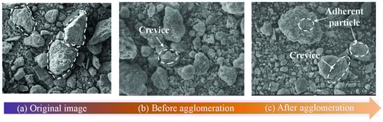 It can be seen from Figure 7 that when the ball-to-gangue ratio is 3~9, Δα gradually decreases with the further increase in the grinding time. It is worth noting that the decrease range is small within 0~30 min and increases within 30~60 min, signifying that when the ball-to-gangue ratio is relatively small, the variation of the heterogeneity degree of the particle size of gangue increases over time. This is because the collision probability between gangue and grinding medium is small when the ball-to-gangue ratio is small in the grinding process. At the same time, due to the short grinding time, the grain size of gangue is still generally large in the grinding process, resulting in small changes in the heterogeneity of gangue size distribution within the range of a 3~9 ball-to-gangue ratio. With the continuous increase in grinding time, the collision frequency between the gangue and grinding medium will increase, increasing the spatial heterogeneity of the change in gangue particle size. When the ball-to-gangue ratio is 12 and 15, the width of the multifractal spectrum first decreases and then increases with the increase in grinding time. From 0 to 30 min, the spatial heterogeneity of particle size structure is debilitated. The reason for this phenomenon may be that the particle size structure of gangue continues to decrease after it reaches a low level in a short timeframe (30~60 min). As a result of agglomeration among some small particles, the particle size increases due to extrusion, or some small particles become embedded in large particles’ voids or attached to their surfaces (Figure 8). The spatial heterogeneity of the particle size structure is enhanced. There are always tiny strips and flakes attached to the surface of large particles, and the pores are also filled by small particles. Therefore, when the grinding medium acts on large particles, part of the energy is used for crushing the small particles, which leads to the re-crushing of the small particles, which intensifies the heterogeneity of the overall particle size distribution of the gangue.