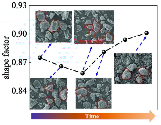 The shape coefficients of gangue particles at different time stages under any ball-to-gangue ratio are shown in Figure 10. It can be seen from the figure that the initial average shape coefficient of the gangue is relatively small, and the particles are independent of each other without intercalation. As the ball grinding time increases, the shape coefficient decreases. This is because gangue has many weak structures, and the impact and extrusion will break the gangue from its fragile structure, thus forming small particles with irregular shapes. This process not only reduces the grain size of the gangue but also increases the irregularity of the gangue, so the shape coefficient gradually decreases. With the increase in time, the grinding effect is realized through point contact between the grinding medium and the gangue. In this process, the irregular particles generated by the new fracture rotate, the prominent edges and corners are gradually worn down, and the roundness of the particles increases continuously, which further increases the shape coefficient. The final gangue structure is ellipsoid, and the particle surface is rough due to the development of a large number of tiny particles inlaid and micropores. In the process of ball milling, the shape coefficient of gangue is consistent with the change process of multiple analysis parameters such as D(0) and D(1).