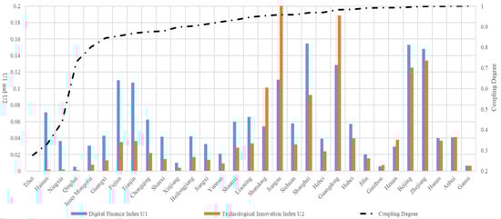 Digital technology innovation in the financial sector has led to the emergence of digital inclusive finance [4], an emerging financial service model [5] and a key guarantee for the sustainable advancement of technological innovation [6]. It provides new financial services such as mobile payment, credit, insurance, and financing by utilizing the new generation of information digital technology [7], and frees financial businesses from the constraints of “people” and “physical departments”. In order to better match the target customer groups and improve the efficiency of capital allocation [8,9], it also broadens the scope and use-depth of finance, enhances user experience and access to finance [10], and removes barriers that traditional finance faces when supporting innovative activities. We should strengthen the development of digital finance and improve the contribution of innovation to economic growth [11]. Therefore, it is crucial to research how to encourage sustainable economic development through the coordinated development of digital finance and technological innovation.
