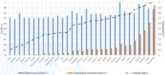 - When the development of digital finance and technological innovation are imbalanced, the coupling coordination degree between the two is relatively low. Regional governments should ensure the synchronous and balanced development of digital finance and technological innovation, guiding digital finance to serve the real economy of technological innovation and strengthening technological innovation’s support for digital finance. Governments should direct the transformation of technological innovation achievements and assist in the development of digital finance, fostering a virtuous coupling and interaction between the two, and achieving a win–win development for both digital finance and technological innovation.