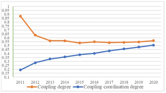 Coupling coordination trend of digital finance and technological innovation from 2011 to 2020.