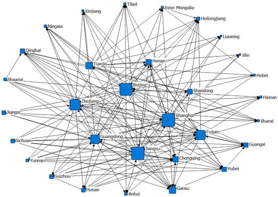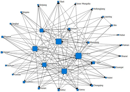 To study the structural characteristics as well as the role and status of each province in the network, this study applies the SNA method [50,51,52,53] to establish the spatial association network. The social network analysis (SNA) method is an interdisciplinary approach that was first used in sociology; it was also later used in the fields of business and economics [54]. The SNA method employs graph theory and algebra to examine network relationships. It enables quantitative analysis of spatial relationships and provides empirical tools for testing theoretical hypotheses. By constructing a spatial correlation network, SNA can effectively reveal the interregional characteristics of coupling between digital finance and technological innovation.