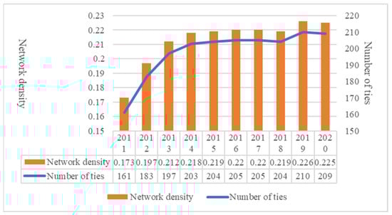 To analyze the overall network structure characteristics, this study calculates three indicators, including network density, network hierarchy, and network efficiency [55]. Firstly, the overall network density is used to measure the correlation strength between the network subjects, the high network density represents the spatial relationship between the subjects is close, and vice versa.