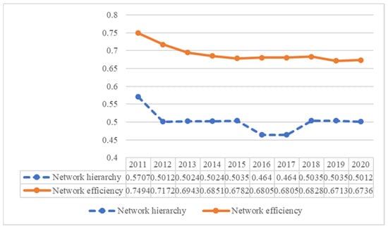 Secondly, the overall network hierarchy is used to describe the hierarchical structure of the network. If the network hierarchy is lower, there would be fewer edge nodes and the network correlations would be strengthened. Finally, the network efficiency is used to measure the connection efficiency of the network. That is, the number of redundant connections in the network. The lower the network efficiency is, the more redundant connections in the network are, and the more stable the network structure is; on the contrary, the greater the network efficiency, the weaker the connection between the agents, and the weaker the stability of the network structure.