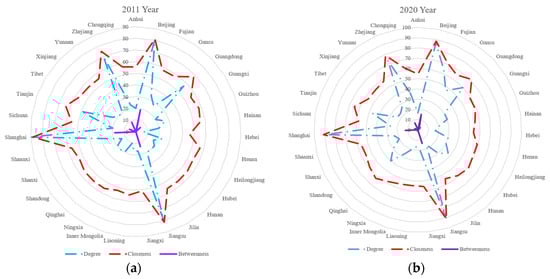 The nodes at the center of the social network have a great influence on other individuals. In order to know the status and function of each province in the whole network, it is necessary to analyze the centrality of the individual network, using centrality indicators to measure connectivity, intermediation, and accessibility [56]. The measurement indicators mainly include degree centrality, closeness centrality, and betweenness centrality: