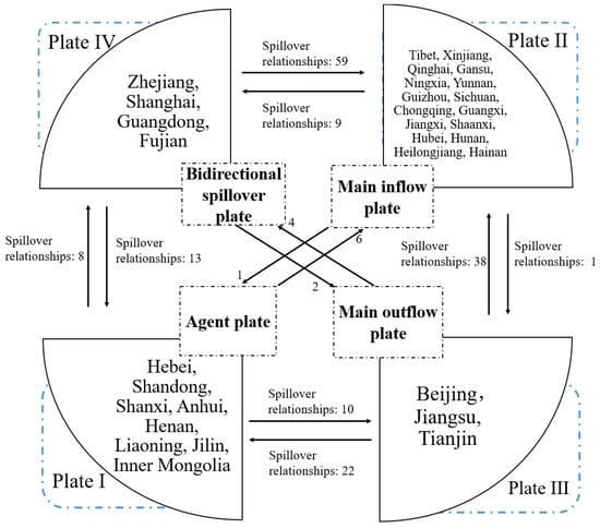 From the perspective of the intra-plate relationship, there is a spillover effect in plate III and plate IV, while there is no spillover effect in plate I and plate II, that is, there is a significant spatial network correlation between Beijing, Tianjin, Shanghai, Guangdong, Zhejiang, Jiangsu, and other eastern cities. From the perspective of the spillover relationship between plates, plate III has a spillover relationship with plates I, II, and IV, and plate IV has a spillover relationship with plates I and II, indicating that the more developed cities in the east have significant spillover effects in the process of coupling and coordinated development of digital finance and technological innovation, which will promote the coordinated development of central and western cities.
