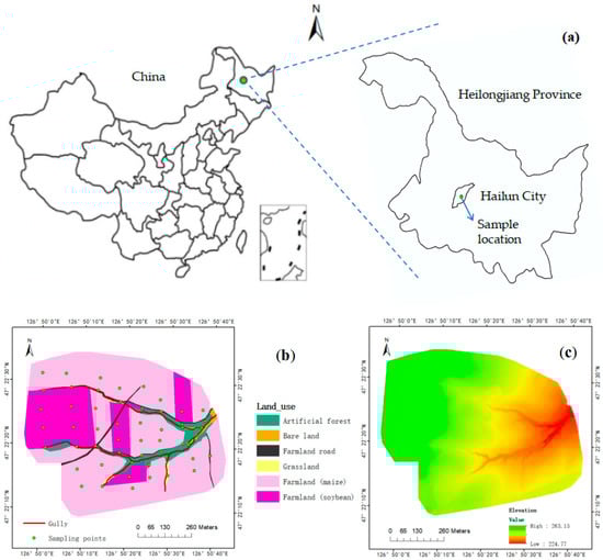 Location of the study area in Heilongjiang Province, China (a), land use types (b) and elevation (c) of the micro-catchment.