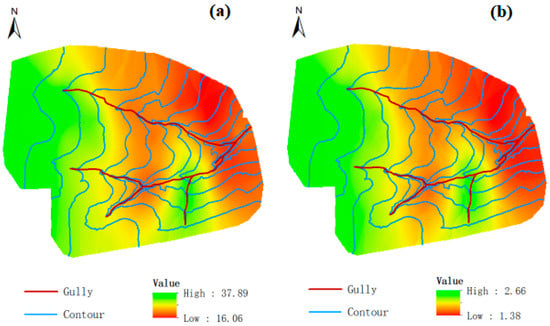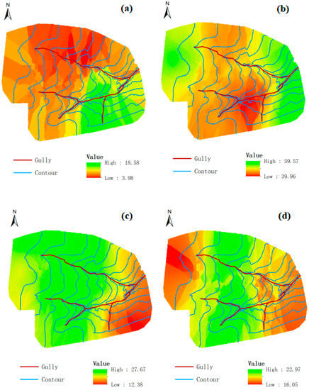 Figure 2 shows that the spatial distribution of soil organic carbon (SOC) was similar to that of total nitrogen (STN), with higher values observed in the western part of the micro-catchment compared to the middle and eastern regions. Notably, great spatial variability of SOC (ranging from 16.06 to 37.89 g/kg), as well as STN (ranging from 1.38 to 2.66 g/kg), was observed near the gully area. Specifically, the highest SOC and STN contents were found at the gully head, and gradually decreased towards the gully mouth. Conversely, the lowest SOC and STN contents were observed near the gully mouth in the northeast region.