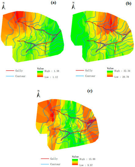 Distribution of soil bulk density (a), water content (b), and clay content (c) in the micro-catchment.