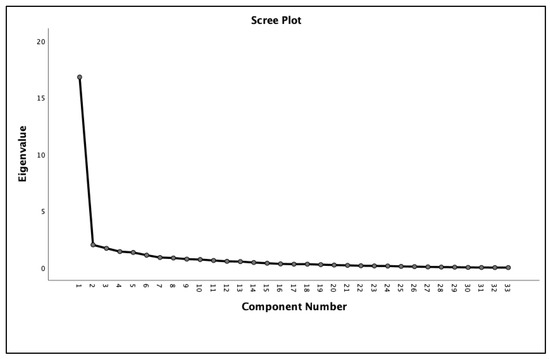 Finally, 3 factors with 62% of the variance were extracted from the remaining 33 items. The scree plot in Figure 1 shows the number of factors.