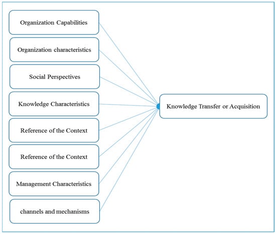 Many former studies on knowledge transfer and acquisition in a different context have been undertaken, among which are critical literature reviews and meta-analyses which were published to clarify previous studies about the factors, methodologies, and context [23,24,25,26,27,28,29,30,31,32]. From these last critical literature reviews and meta-analyses in Table 1, we summarize their framework models in Figure 1. As a result, all these systematic and critical literature reviews and meta-analyses generally discussed knowledge transfer and acquisition in a different context (e.g., inter-firm collaborations, alliances, and buyer-supplier). However, none had written a critical literature review on knowledge acquisition in an international joint venture.