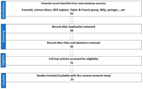 Following recent recommendations that the methodological rigour of literature evaluations in the management and business area should be strengthened (e.g., [40,41,42]), we undertake thorough and meticulous research. First, from a methodological standpoint, a CLR is a repeatable and transparent approach for locating, assessing, and interpreting the existing corpus of research [43]. Furthermore, a critical review is: second, a well-thought-out strategy for analysing the background of a specific body of literature, which seeks to minimize any biases originating from just narrative judgments and uses a defined algorithm, as opposed to a heuristic one, to evaluate the literature [44]. A critical literature review (CLR) provides a thorough audit trail of methodology, judgments, and findings reached by the reviewers, making the study transparent and reproducible [45]. Therefore, producing new ideas and information by synthesizing current academic publications, which may be more relevant and significant than new research, is valid [46]. The technique of this investigation is drawn upon the work of [47]. Ref. [48], the present study’s execution component of the review approach consists of six process phases that address problems with time horizon, database selection, journal selection, article selection, article categorization, and article analysis. The scientific rigour with which these steps are performed is of the utmost significance for a high-quality evaluation [49].