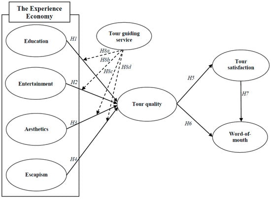 The consumers are more interested in experiential benefits that provide them with pleasurable feelings, exciting fantasies, and enjoyable activities [10,23,24]. These types of experiences are, more importantly, a key factor that affects tour quality [25]. This means that if tourists have a great experience, such as education, entertainment, aesthetics, and escapism, they would think that the package tour provides good quality. The empirical research also supported this relationship. For example, Oh, Fiore, and Jeoung [5] examined the effect of experience economy on the overall perceived quality using 419 samples, and they found that esthetics has a positive influence on the overall perceived quality. In addition, Rajaobelina [26] explored the impact of the customer experience on relationship quality with 289 adult respondents from a panel of individuals who reside in Canada. The results of the data analysis indicated that customer experience is an important factor that affects relationship quality. More recently, Moon and Han [27] developed a research model in order to identify the importance of experience in the tourism industry. They suggested that the experience provided by travel destinations plays an important role in enhancing the value of travelers. This study proposed the following hypotheses, which are based on the theoretical and empirical backgrounds.