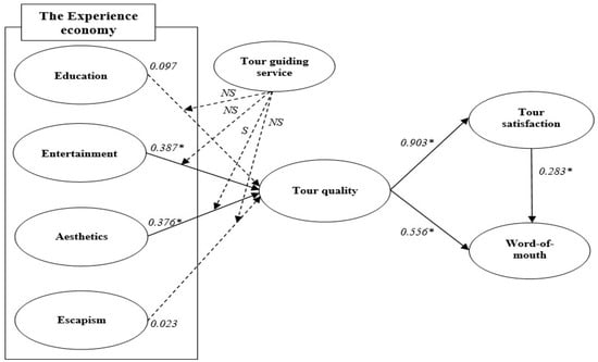 Table 4 shows the results of the structural equation model analysis, which was conducted for testing the proposed hypotheses. The results showed the statistical goodness level that was suggested by Anderson and Gerbing [51] (χ2 = 815.882, df = 258, χ2/df = 3.162, p < 0.001, NFI = 0.929, IFI = 0.950, CFI = 0.950, TLI = 0.942, and RMSEA = 0.082). According to the results of statistical analysis, among the four sub-dimensions of experience economy, entertainment (β = 0.387 and p < 0.05) and aesthetics (β = 0.376 and p < 0.05) had a significant effect on tour quality, so Hypothesis 2 and Hypothesis 3 were accepted. Furthermore, tour quality had a positive effect on tourism satisfaction (β = 0.903 and p < 0.05) and word-of-mouth (β = 0.556 and p < 0.05), so Hypothesis 5 and Hypothesis 6 were accepted. Finally, tourism satisfaction was found to play an important role in regards to forming word-of-mouth (β = 0.283 and p < 0.05), so Hypothesis 7 was accepted.