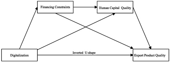 In the following, we will discuss the impact of digitalization on the quality of export products. We will also detail the two channels of alleviating financing constraints [23] and human capital accumulation [24] and elaborate on the logical relationship between variables. A theoretical model is presented in Figure 1.