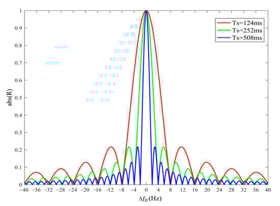 Figure 1 is a frequency fuzzy search function. From the positions of the zero points of the curves in the figure and the period of the sinc function, the maximum step size of the Doppler search can be determined to be 1/Ts. As can be seen, the longer the integral time, the smaller the Doppler search step size and the higher the accuracy, and hence, the more search time and resources consumed. Noteworthily, the conclusion that the longer the integral time, the higher the frequency search accuracy is drawn from the perspective of the maximum search step size, which does not mean that the highest frequency accuracy can only reach 1/Ts.