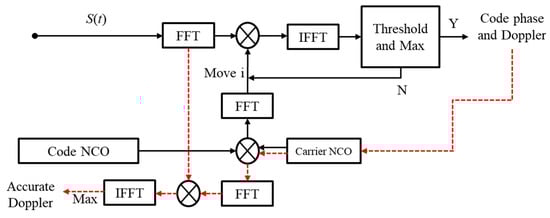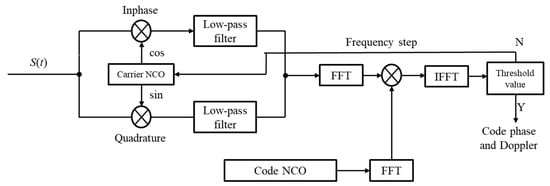 Spread-spectrum signal acquisition, in essence, is the identification of the correct code phase and carrier Doppler in signals that are received through two-dimensional searches in both the time and frequency domains by taking advantage of the excellent autocorrelation properties of the spreading spectrum codes [12]. Early spread-spectrum signal acquisition methods typically relied on time-domain sliding correlation, sequence estimation searches, and the matched-filter technique, which gradually improved the search efficiency. The FFT method, proposed by Grant [13,14], enabled the code phase search using one operation, truly achieving a parallel search in the time domain. Huang [15] proposed a modified PMF-FFT acquisition algorithm to improve the accuracy of the Doppler frequency offset estimation. The authors of [16] used an improved FFT circular correlation scheme with circular shifts in the frequency domain, which performed all frequency searches within a preset range by cyclically shifting the signal FFT results and delivered higher computational efficiency than conventional algorithms. Nonetheless, the scheme employed a fixed step size to compute all frequencies within the estimation range, which resulted in many invalid frequency searches [17]. The frequency search range had to be preset, and at least two times the expected maximum Doppler frequency was required to provide enough margin of error. However, there was still a trade-off between the search range and capture speed depending on the particular application and requirements. Moreover, following the maximum discrimination acquisition, the scheme fed back the phase and Doppler of the maximum values of the correlation upon the completion of a full search regardless of whether the acquisition was accurate and whether there were desired signals. To address these problems, this paper combines the fixed threshold and maximum discrimination methods to discriminate the acquired results, so as to integrate their advantages while making up for their drawbacks. Using a low-frequency spread-spectrum signal with a low Doppler frequency, the frequency circular shift search method changes the traversal search to the step-by-step search in the preset range, thereby avoiding excessive invalid searches and the difficulty in setting the search range.