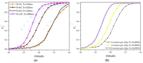 As illustrated in Figure 4a, as the code length increases, the integral time Ts increases by the same factor, and the acquisition performance under a low SNR is significantly boosted. This is because an increasing integral length leads to a higher correlation peak and a larger possibility of successfully extracting useful information from the noise. Furthermore, the acquisition success probability is calculated under the conditions that the code length N = 63 and there are two carriers in each chip (Ts = 126 ms). The calculated integral time is very close to that calculated using N = 31, and the acquisition probabilities in the two cases are not much different either. This suggests that under a constant sampling frequency, only increasing the code length cannot remarkably improve the acquisition performance if the integral time remains unchanged. If the number of carriers in a chip remains unchanged (Tc is constant), lengthening the spreading spectrum code will increase the integral time and thus significantly enhance the acquisition performance. In low-frequency signals, only a limited number of carriers can be used within a chip so as to ensure the bit rate and bandwidth. The larger the number of intra-chip carriers, the wider the chip and the smaller the bandwidth. The simulation results in Figure 4b show that within a certain SNR range, the acquisition probability is significantly raised and the acquisition performance improved as the number of carriers in the chip increases.