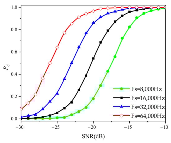 The fixed spreading spectrum code length N = 63, the carrier frequency fc = 1000 Hz, and there are four carriers in one chip (chip length Tc = 4 ms). For the received signal, the chip phase Δτ = 30 chips and the Doppler fD = 1 Hz. The variation in the acquisition probability with the signal-to-noise ratio (SNR) is calculated under four different sampling frequencies. At each sampling frequency, 5000 Monte Carlo simulations are performed. An acquired result with a chip error not exceeding 0.2 chips and a carrier frequency error less than 0.5 Hz is identified as a successful acquisition, and based on this, the corresponding successful acquisition probability Pd is calculated.