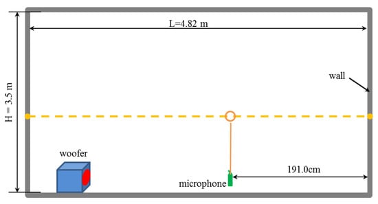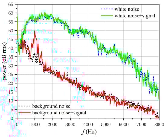 In order to verify that the accuracy of the algorithm and the acquired signal is indeed the desired signal, the spread-spectrum signal reception experiment is carried out in a closed room with a multipath environment where there is natural reverberation and mechanical noise from the signal transmission and acquisition system. The experimental layout is shown in Figure 7. As illustrated, the woofer for the signal acquisition is located directly in front of the sound source and has a distance of 191.0 cm away from the front wall. The speed of sound in air is 340 ms−1. The transmit signal is a spread-spectrum signal containing the bit information, with the spreading spectrum code length of N = 63, the chip width Tc = 4 ms, and the carrier frequency of 1000 Hz. The sampling frequency is set to 16 kHz. Considering that it is only for testing the acquisition performance, the data acquisition time is set to 20 s, which is enough to satisfy the requirement for signal length. Two groups of experiments with high signal-to-noise ratios and low signal-to-noise ratios are adopted. When the correlation peak exceeds the threshold, the acquisition can be achieved. By comparing the time delay difference of the captured reflected signal with the theoretical time delay calculated by the real reflected path, the code phase accuracy of the captured signal can be further judged. As shown in Figure 8, the power of the background noise individually measured is concentrated at 281 Hz, and the peak in the power spectrum is 50.80 dB; the power peak at the center frequency of the measured signal in the background noise environment is 49.86 dB. In the white noise environment, the signal power is much lower than the noise power.