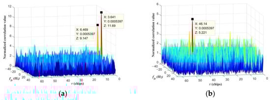 As can be seen in Figure 9a, the proposed algorithm can satisfactorily acquire the spread-spectrum signals that have a peak power equivalent to that of the background noise; there are two obvious correlation peaks in the acquired result, of which the relatively low correlation peak is thought to be caused by the signal reflected from the front wall. The time delay difference between the reflected signal captured and the direct signal is 2.828 chips, and the theoretical difference is 2.809 chips. The distance between the woofer and the front wall calculated from the time delay difference in the spread-spectrum signal is 192.3 cm, and the experimental error is only 1.3 cm. Hence, the errors in the time delay difference and distance are both much smaller than the theoretical errors (0.5 chip and 68 cm, respectively) in spread-spectrum signal ranging. This indicates that the acquisition algorithm can not only correctly acquire the code phase and Doppler, but also achieve a high acquisition accuracy and ranging accuracy. Since there are many sampling points in one chip, the time of arrival of the signal can be determined more accurately using maximum correlation discrimination. Although the correlation peak width exceeds one chip, the maximum discrimination method can, to a large extent, overcome the ambiguous error within the chip.