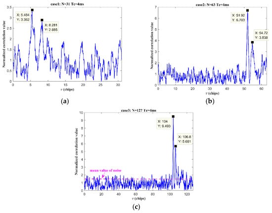 Acquired results for spread-spectrum signals with different code lengths N: (a) Case 1, N = 31; (b) Case 2, N = 63; (c) Case 3, N = 127.