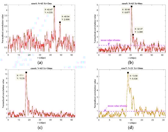Acquisition correlation curves at different numbers of intra-chip carriers: (a) Case 4, 2 carriers per chip; (b) Case 5, 8 carriers per chip; (c) Case 6, 16 carriers per chip; (d) Case 7, 16 carriers per chip (N = 31).