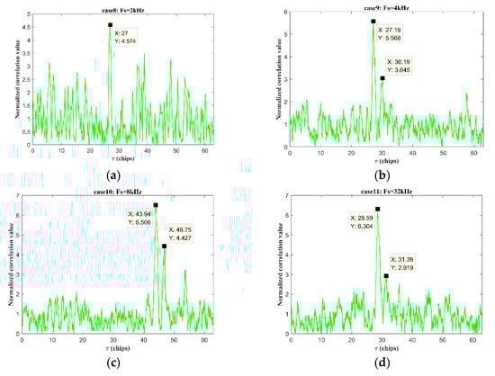 Acquisition correlation curves at different sampling frequencies: (a) Case 8; (b) Case 9; (c) Case 10; (d) Case 11.