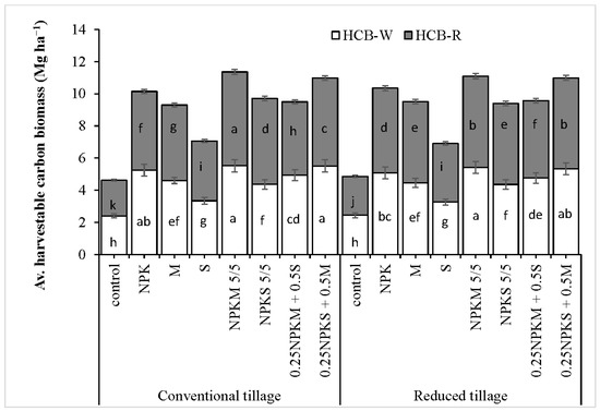 Average annual harvestable C biomass as influenced by different fertilization treatments under CT and RT. Each bar represents mean ± SD. Bars with unlike lower case letters (e.g., a, b, c, etc.) are statistically significant (p < 0.05) from each other. Solid and no-filled stacked portions show harvestable C biomass of rice and wheat, respectively. M is animal manure; S is stubble/crop residue incorporation; NPKM 5/5 is 50% recommended NPK along with 50% manure; 0.25 NPKM + 0.5 S is 25% NPK, 25% manure, and 50% crop residue; and 0.25 NPKS + 0.5 M is 25% NPK, 25% crop residue, and 50% manure.