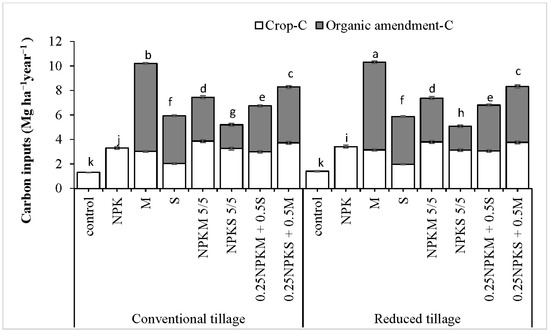 The combined use of organic amendments and inorganic fertilizers resulted in better harvestable carbon (C) biomass of rice and wheat under both tillage systems as compared to that from manure-alone and straw incorporation (Figure 1). Mineral nitrogen deposition is necessary to enhance harvestable C biomass. Therefore, addition of nutrients either from mineral or organic sources, as well as the combination of both, increased C biomass production [42]. The nitrogen (N) addition along with organic amendments is a promising practice to enhance rapid microbial growth [27], leading to more harvestable C biomass production. However, the harvestable C biomass also varied with crop type [43]. Our results are also in accordance with those reported by Xu et al., 2011 [43].