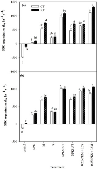 The soil organic carbon (SOC) difference between the initial and the final year is assumed to be the SOC sequestered (S measured in kg ha−1 year−1) under each treatment [30]. Positive and negative magnitudes of SOC were interpreted as gains and losses in SOC for all treatments, respectively: