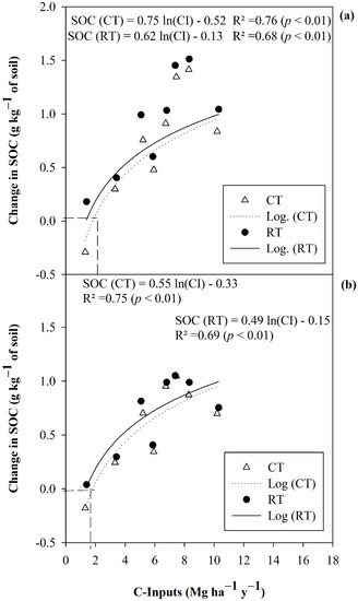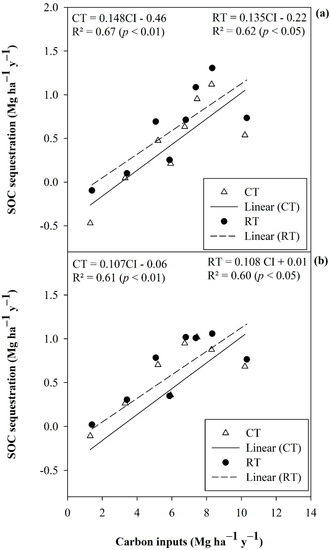 Relationships between SOC sequestration and annual C inputs in relation to different fertilization treatments under CT and RT treatments at (a) 0–15 cm and (b) 15–30 cm soil depths. Determination coefficients indicate significant correlation at p < 0.05.