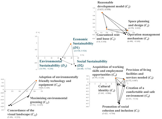After analyzing the dimensions, the influences and causal positions among the criteria were observed. The threshold value of ri + ci, calculated by averaging the number of all criteria, is 5.799. Among the 12 criteria, 5 criteria are higher than the threshold. In order, these are space planning and design (C3) (6.578), the operation management mechanism (C4) (6.498), the provision of living facilities and services needed (C5) (6.372), the creation of a comfortable and safe environment (C8) (6.331) and the adoption of environmentally friendly technology and equipment (C10) (5.825). The lowest three criteria are the acquisition of working skills and employment opportunities (C6) (4.791), the promotion of social cohesion and inclusion (C7) (5.425) and the concordance of the visual landscape (C12) (5.456). Based on ri − ci, six criteria are greater than the threshold value of 0, indicating the cause position; these include the adoption of environmentally friendly technology and equipment (C10) (0.129), the acquisition of working skills and employment opportunities (C6) (0.128), guaranteed rent and lease (C1) (0.104), a reasonable development model (C2) (0.958), the provision of living facilities and services needed (C5) (0.087) and space planning and design (C3) (0.032). The rest of the criteria imply an effect position (i.e., the ri − ci value is below zero); these are the promotion of social cohesion and inclusion (C7) (−0.704), the concordance of the visual landscape (C12) (−0.233) and the operation management mechanism (C4) (−0.169). The ones with the smallest values are the most affected by other criteria.