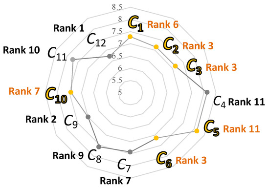 The DANP weight combined with the modified VIKOR was utilized to evaluate the performance and gap for Taiwan’s case (see Table 7). Among the three dimensions, the performance of social sustainability’s (D2) value of 7.457 is better, followed by economic sustainability (D1) with 7.429, and the last performance of environmental sustainability (D3) with 7.286, reflecting that the gap of the aspiration level of environmental sustainability (D3) of 0.271 is the largest. In terms of criteria (see Table 7 and Figure 4), six criteria reveal better performance (i.e., higher than the total performance) in the following order: operation management mechanism (C4) and the provision of living facilities and services needed (C5) with 8.143, maximizing environmental greening (C11) with 7.714, the creation of a comfortable and safe environment (C8) with 7.571, the promotion of social cohesion and inclusion (C7), and the adoption of environmentally friendly technology and equipment (C10) with 7.429. Conversely, the poor performers are as follows: the concordance of the visual landscape (C12) with 6.714, cultural identity (C9) with 7.000, a reasonable development model (C2), space planning and design (C3), the acquisition of working skills and employment opportunities (C6) with 7.143 and guaranteed rent and lease (C1) with 7.286.