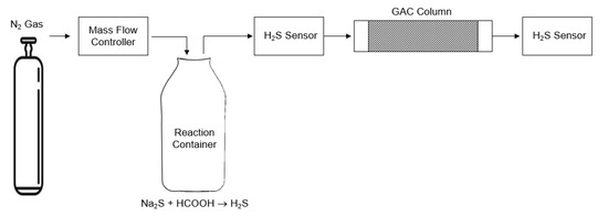 H2S was generated by purging nitrogen (N2) gas through a container containing sodium sulfide with acetic acid. The flow rate of N2 gas entering the column was maintained at 2.5 liters per minute (L/min). The concentration of H2S was measured using H2S gas loggers at the inlet and outlet. The gas loggers, obtained from AcrulogTM (Clontarf, Australia), were standardized to ±2 parts per million (ppm) using a gas cylinder. When active, the sensors recorded data every 10 seconds. The experimental setup is depicted in Figure 1.