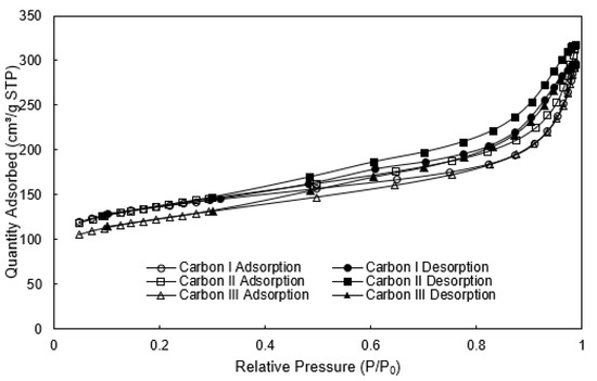 The isotherms of Carbon I–III are shown in Figure 2. All the carbon samples displayed International Union of Pure and Applied Chemistry (IUPAC) type-I isotherms. Each of the carbons demonstrates a significant increase in nitrogen adsorption at higher relative pressures, evident by the “ski-jump” shape in each isotherm. The hysteresis loops in each isotherm are well-pronounced, which suggests that each of the carbon samples have a well-developed microporosity and mesoporosity.