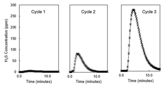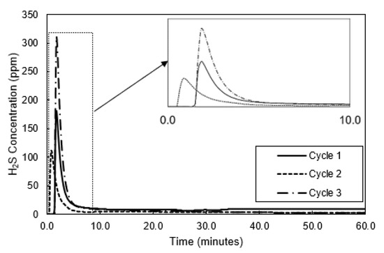 After each sample of GAC was subjected to a stream of H2S, the carbon was regenerated by heating to a temperature of 500 °C. Figure 4 shows the concentration of H2S during successive regenerations for the same sample as in Figure 2, Sample #3. The height of each peak in Figure 4 varies based on the magnitude of H2S that was introduced to the carbon during adsorption. The theoretical amount of H2S that entered the column, based on experimental data, was 2.0 mg, 2.2 mg, and 3.5 mg for the first, second, and third cycles, respectively. It is believed that Cycle 3 produced the largest concentration of H2S during thermal regeneration both because the carbon had been saturated three times and because the input during adsorption was the largest of the three cycles. The total amount of H2S desorbed during the previously described cycles was 1.5 mg, 0.8 mg, and 1.3 mg, respectively.