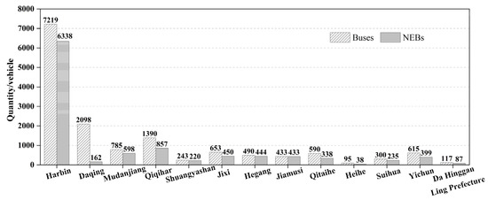 As shown in Figure 1, Harbin has the largest number of buses, followed by Daqing. Heihe has the least number of buses. The city with the largest number of NEBs is Harbin, followed by Qiqihar, and the city with the least number of NEBs is Heihe.