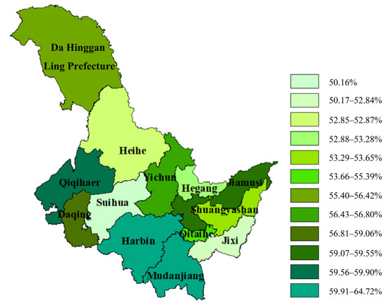 According to Table 5, the city with the largest URR in Heilongjiang Province is Daqing, which is 14.93%. This is followed by Harbin, which has a URR of 14.35%. The city with the smallest URR is Yichun, which is 6.09%. In China, the URR in urban built-up areas generally reaches 15%. The URR of the 13 cities in Heilongjiang Province did not meet the requirements.