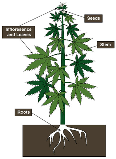 Cannabis plant parts include seeds, stem/stalk, inflorescence, leaves, and roots (Figure 1) [16].