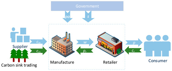 Carbon neutrality, which lies in maintaining the balance between carbon emission and carbon utilization, as well as the balance between carbon source and carbon sink, has a focus on the development of carbon circular economy based on carbon trading [9]. Some scholars have reviewed a large number of existing studies from the perspective of value chain to verify the importance of circular economy [10]. Scholars have found that climate finance and carbon pricing can significantly affect air quality and even help improve people’s health [11]. In a carbon circular economy, the carbon trading commodities are mainly carbon emission allowance (CEA) and carbon sink projects. Carbon emission enterprises can purchase carbon sink projects through the carbon trading market to offset their carbon emissions so that they can reach the stipulated carbon emission requirements, thereby recognizing the ecological value of carbon sink carriers such as forests [12]. Since the carbon pricing of carbon allowance in the existing carbon trading market is generally higher than that of carbon sink trading, enterprises are more inclined to choose carbon sink trading as their main method of carbon offsetting [2]. As an important part of the circular economy, scholars have reviewed a large amount of the literature on the game theory of the closed-loop supply chain, and found that incentive is an important factor affecting the closed-loop supply chain [13]. So, how can governments create incentives for closed-loop supply chains? They can do this through policies, especially subsidies, incentives and market mechanisms. Not only is the efficiency of emission reductions based on market mechanisms much higher than that of the administrative order; carbon trading is also favored by the government and enterprises because of its economy, stability and controllability [7,14,15]. Plenty of studies have been conducted on carbon market trading in the supply chain, which mainly focus on decisions in the production, pricing and emission reduction of enterprises in the supply chain under the carbon cap-and-trade market. Benjaafar et al. introduced carbon allowance trading into the supply chain for the first time and discussed the impact of carbon emission costs on production decisions and the total costs of enterprises [16]. Then, scholars found that enterprises’ decision-making is influenced by fairness concerns to a certain extent [17,18]. Therefore, with the continuous improvement of the carbon trading market and mechanisms, supply chain coordination issues arising from carbon emission allowance allocation and its reward and punishment system have become the focus of research.