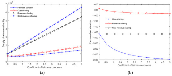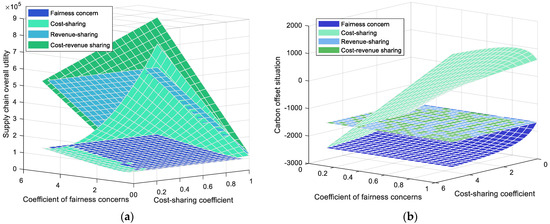 Supply chain utility and carbon offset situation under changes in fairness concern and in the cost-sharing coefficient; (a) utility of supply chain; (b) carbon neutrality of the supply chain.