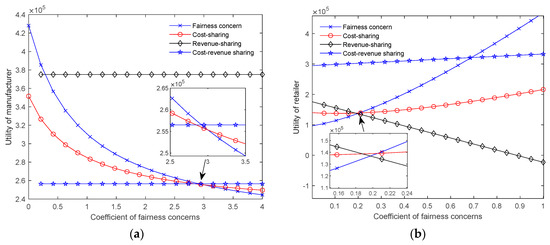 As shown in Figure 3a, in the manufacturers coordination situation, in most cases, using a revenue-sharing contract can effectively realize the Pareto improvement of manufacturing utility, but cost-sharing contracts and cost–revenue-sharing contracts can only reach Pareto improvement when retailer’s fairness concern is high enough. This is because under the influence of retailer’s fairness concern, manufacturers under cost-sharing contracts and cost–revenue-sharing contracts need to bear the extra recovery costs of retailers, resulting in a decline in their own benefits, and in government penalties for failing to meet carbon-neutral targets. In this case, the benefits of the manufacturer are lower than that of the retailer. The revenue-sharing contract can balance this situation well, which leads to an increase in the manufacturer’s utility. As shown in Figure 3b, it can be found that the cost–revenue-sharing contract can better improve retailer’s utility. This is because when the retailer cares more about fairness, they are increasingly unable to achieve the goal of carbon neutrality in the supply chain, so they can only choose to bear the penalty in pursuit of higher utility, which leads to a decline in manufacturer’s income, even lower than that of the retailer. At this time, a cost-sharing contract can better balance the income gap and improve the efficiency of the retailer. This suggests that the manufacturer should try to eliminate the fairness concerns of the retailer; otherwise, it will not only fail to achieve carbon neutrality in the supply chain, but will also lead to a decrease in the manufacturer’s own utility and bring double losses.